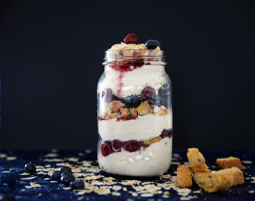 - Bouw de mascarpone trifle laag voor laag op met de vanille mascarpone crème, de kleine stukjes cantuccini afgewisseld met de blauwe bessen, de kersen en de Kers-Amandel-Crema Azijn.