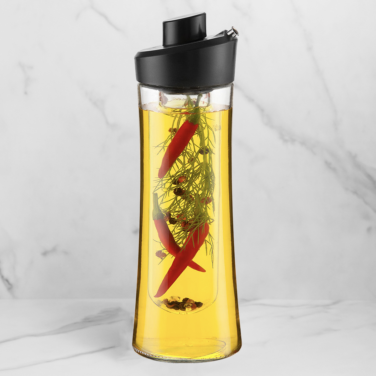 Zelf kruidenolie maken? Dat kan met de Herb Oil Infuser! Vul de schenker met olijfolie en voeg in het middelste gedeelte je favoriete kruiden toe. Bijvoorbeeld knoflook of verse takken...