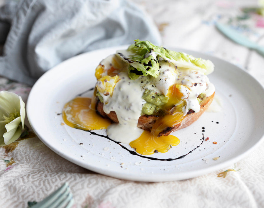 - Assembler le plat : Réchauffer les œufs pochés dans l'eau chaude si nécessaire. Répartissez les toasts dans quatre assiettes. Tartinez chaque morceau de pain grillé avec la garniture à l'avocat et placez deux œufs pochés sur chaque morceau. Verser la sauce sur les œufs et saupoudrer du mélange d'épices Egg Salt au goût. Garnir chaque toast d'une cuillerée de salade et terminer le plat avec quelques gouttes de Glaçage Balsamique Naturel.