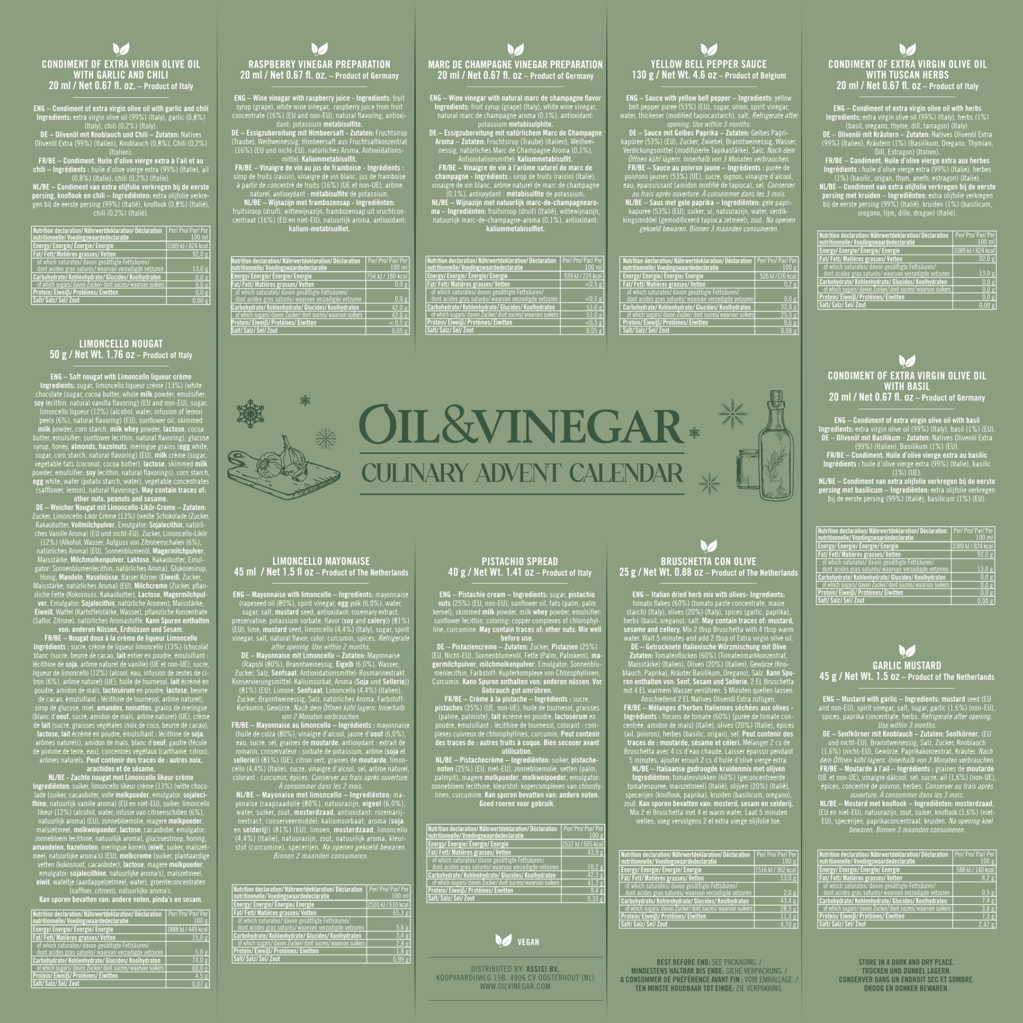Wacht niet te lang! Onze adventskalender is elk jaar een favoriet en de voorraad is beperkt. Bestel jouw exemplaar op tijd en voeg een vleugje magie toe aan de decembermaand met de smaakvolle ontdekkingen van Oil & Vinegar.