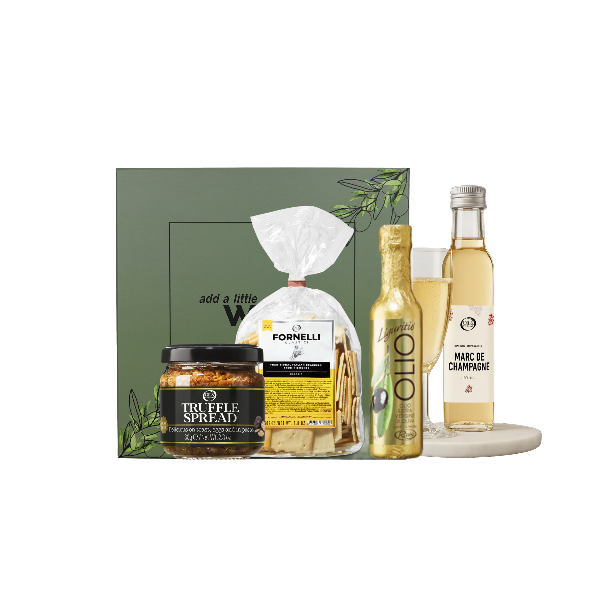 Vier de feestdagen in stijl met dit sprankelende cadeaupakket. Geniet van de verfijnde Truffelspread, de knapperige Fornelli crackers en de elegante extra vergine olijfolie in gouden fles. De exclusieve Marc de Champagne azijn zorgt voor een feestelijke twist bij salades en hapjes. Een gouden combinatie die elke borrel of diner naar een hoger niveau tilt.