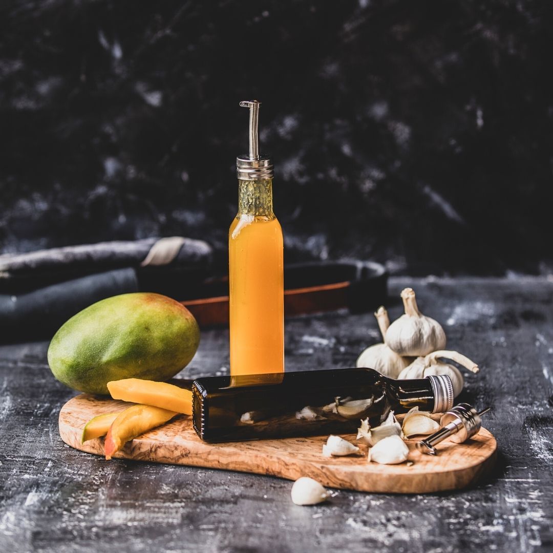 Fruitig + intens: een topcombinatie als je het ons vraagt. Daarom passen Mango-azijn en Extra vierge olijfolie met knoflook zo goed bij elkaar! Combineer de twee als saladedressing in een salade met gerookte kip, avocado en veldsla.