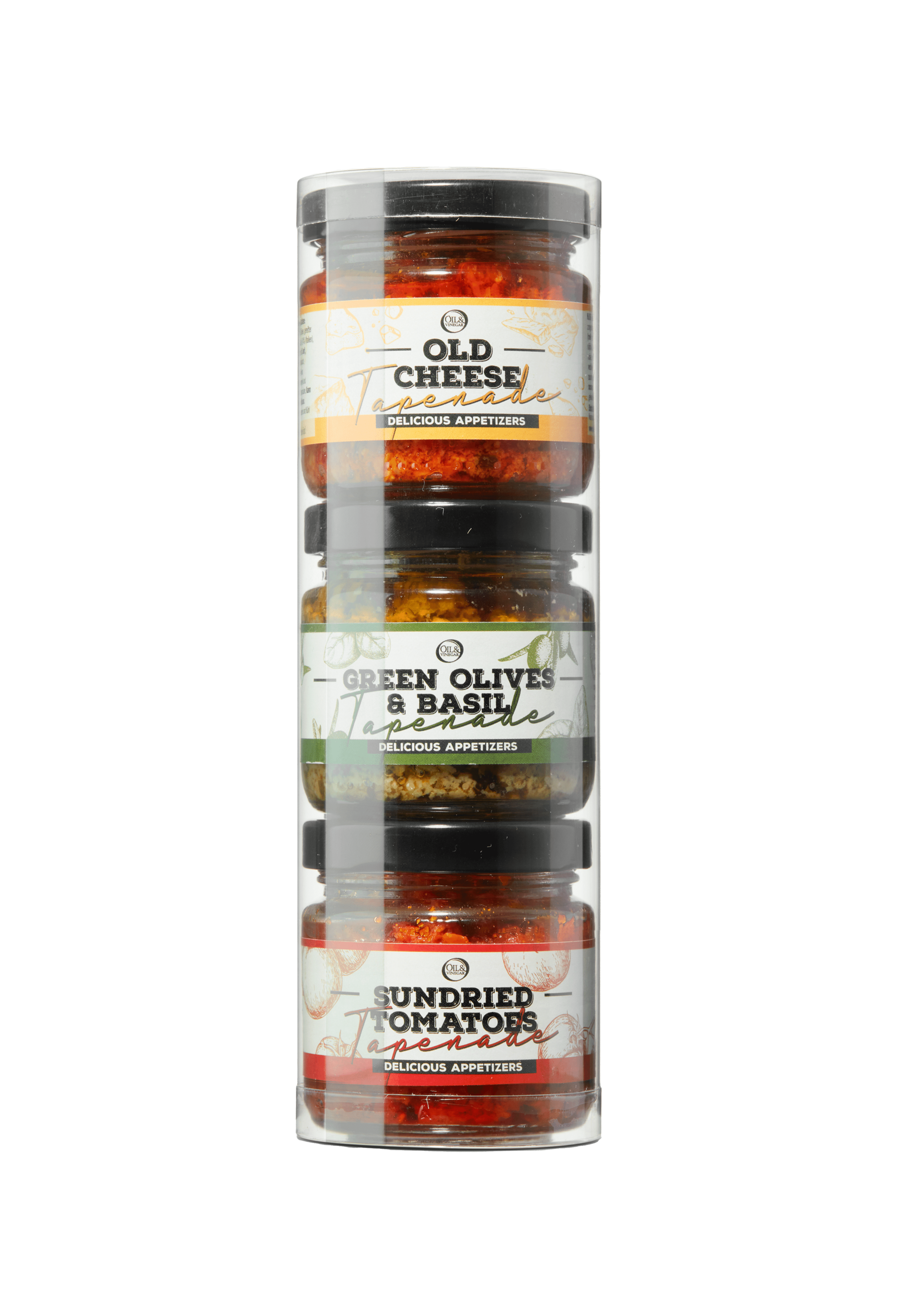 Set van drie verschillende tapenades: kaas, olijf & basilicum en zongedroogde tomaat. Ideaal voor bij de borrel; smeren op een toastje en klaar. Ook erg leuk om cadeau te geven.